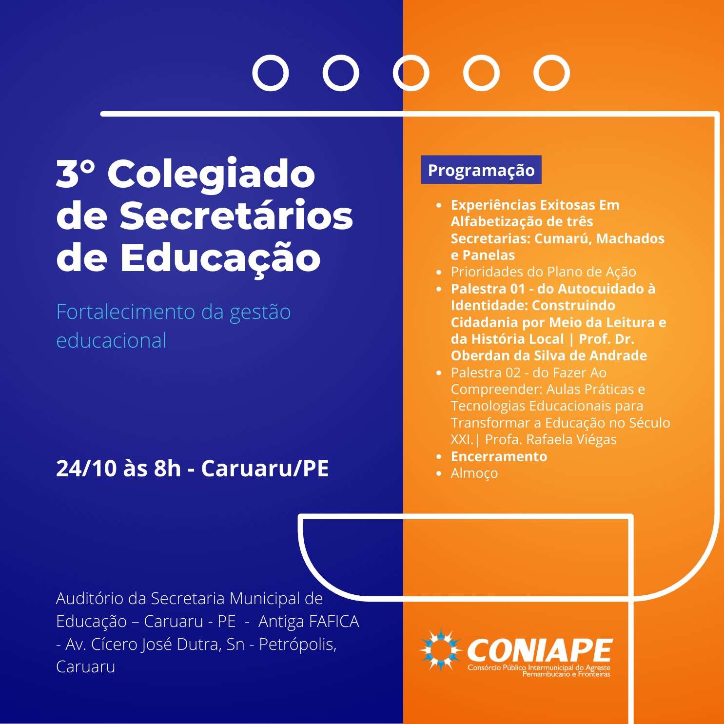 No dia 24 de outubro de 2025, será realizado no auditório da Secretaria Municipal de Educação em Caruaru o 3º encontro do Colegiado de Secretários Municipais de Educação do CONIAPE, com o objetivo de fortalecer a gestão educacional na região por meio da cooperação, do compartilhamento de experiências e da implementação de políticas públicas que promovam uma educação de qualidade, inclusiva e transformadora.